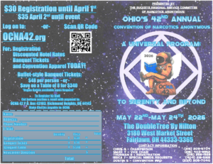 Ohio's 42nd Annual Convention of Narcotics Anonymous A Universal Program: To Serenity And Beyond May 22nd-May 24th 2026 $30 Registration until April 1, $35 April 21 until event Log on to OCNA42.org For Registration, Discounted Hotel Rates, Banquet Tickets, and Convention Apparel TODAY! Click for printable pdf
