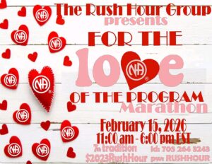 Special EventThe Rush Hour Group presents FOR THE L<3VE OF THE PROGRAM Marathon February 15, 2026 11:00 am- 6:00 pm EST 7th tradition: $2023RushHour Zoom: id: 705 264 3243 pw: RUSHHOUR Click for full-size flier image
