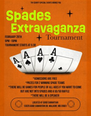Good Samaritan Presbyterian Church 13025 Good Samaritan Drive, Waldorf, MD, United StatesSpecial EventTri-County Area presents Spades Extravaganza Tournament! Saturday, February 28th 5 pm - 10 pm Good Samaritan Presbyterian Church 13025 Good Samaritan Dr. Waldorf MD 20601 flyer