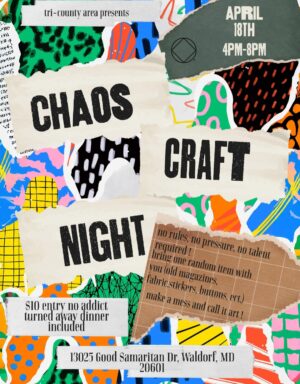 Good Samaritan Presbyterian Church 13025 Good Samaritan Drive, Waldorf, MD, United StatesSpecial EventTri-County Area presents Chaos Craft Night! Saturday, April 18th 4 pm - 8 pm Good Samaritan Presbyterian Church 13025 Good Samaritan Dr. Waldorf MD 20601 flyer