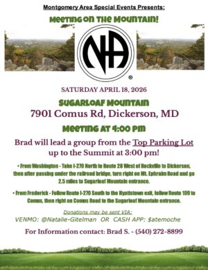 Apr 18 Montgomery Area Special Events Presents: Meeting on the Mountain! 3:00 PM - 6:00 PM Sugarloaf Mountain 7901 Comus Road, Dickerson Event Details Get Directions