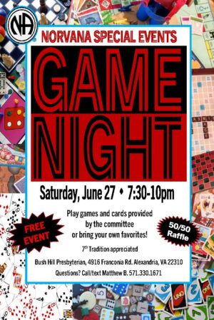 Jun 27 NORVANA Special Events Game Night 7:30 PM - 10:00 PM Bush Hill Presbyterian Church, 4916 Franconia Rd, Alexandria, VA 22310 Franconia Road 4916, Alexandria Event Details Get Directions
