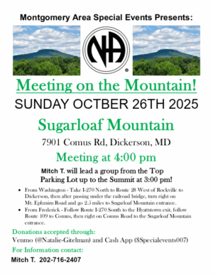 Sugarloaf Mountain 7901 Comus Road, Dickerson, MD, United StatesMontgomery Area Special Events is hosting Meeting on the Mountain! A hike up Sugarloaf Mountain 3pm: Meet in Top parking lot for hike 4pm: Meeting on the top of Sugarloaf Mountain flyer
