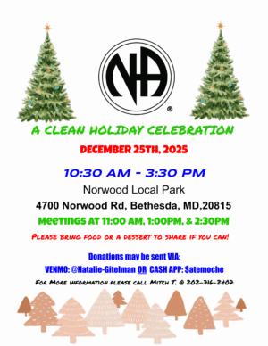 NORVANA Special Events Committee Presents: Christmas Marathon Meeting December 25, 12pm-7pm Free Event Light Refreshments Served, Food Donations & 7th Tradition Appreciated Bush Hill Presbyterian 4916 Franconia Rd Alexandria, VA […]