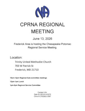 CPRNA REGIONAL MEETING June 13, 2026 Frederick Area is hosting the Chesapeake Potomac Regional Service Meeting Location: Trinity United Methodist Church 703 W Patrick St Frederick, MD 21710 10am-12pm Regional Sub-committee meetings 12pm-1pm Lunch 1pm-5pm Regional Service Committee Contact Info: Dale W (301)514-5270 Chris R (703)822-3397 Click for printable pdf