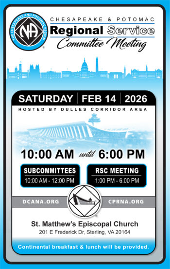 The Dulles Corridor Area is Hosting RSC Chesapeake & Potomac Regional Service Committee Meeting WHAT: At RSC, the committee tries to get a sense of the needs of its own groups and areas as well as those of the fellowship worldwide. Following area committee and resource assignment reports from the RCMs, the regional delegate briefs […]