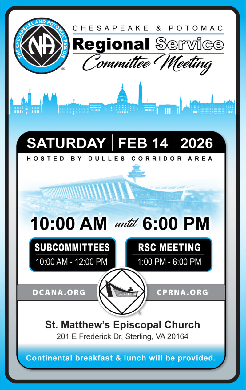 The Dulles Corridor Area is Hosting RSC Chesapeake & Potomac Regional Service Committee Meeting WHAT: At RSC, the committee tries to get a sense of the needs of its own […]