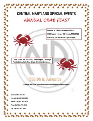Jul 18 CENTRAL MARYLAND SPECIAL EVENTS ANNUAL CRAB FEAST 12:00 PM - 5:00 PM Trinity Lutheran Church 6600 Laurel-Bowie Road, Bowie Event Details Get Directions