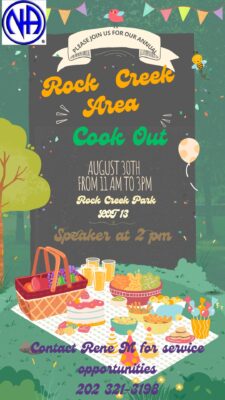Rock Creek Area is hosting a New Year’s Eve Marathon on December 31 from 6:00 PM to 1:00 AM. The event will be held 5034 Wisconsin Avenue NW, Washington DC 20016. There will be continuous meetings starting at 6:00 PM, with a special Speaker Meeting at 11:00 PM. There is parking behind the building. The event is Pot Luck, so bring a special dish. For questions, contact Rene M. at (202) 321-3198. We hope to see you there!